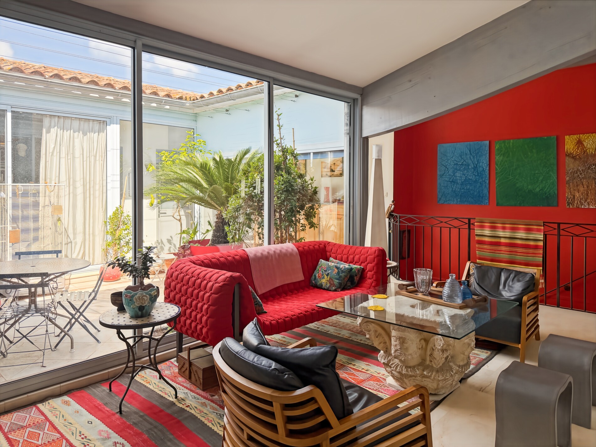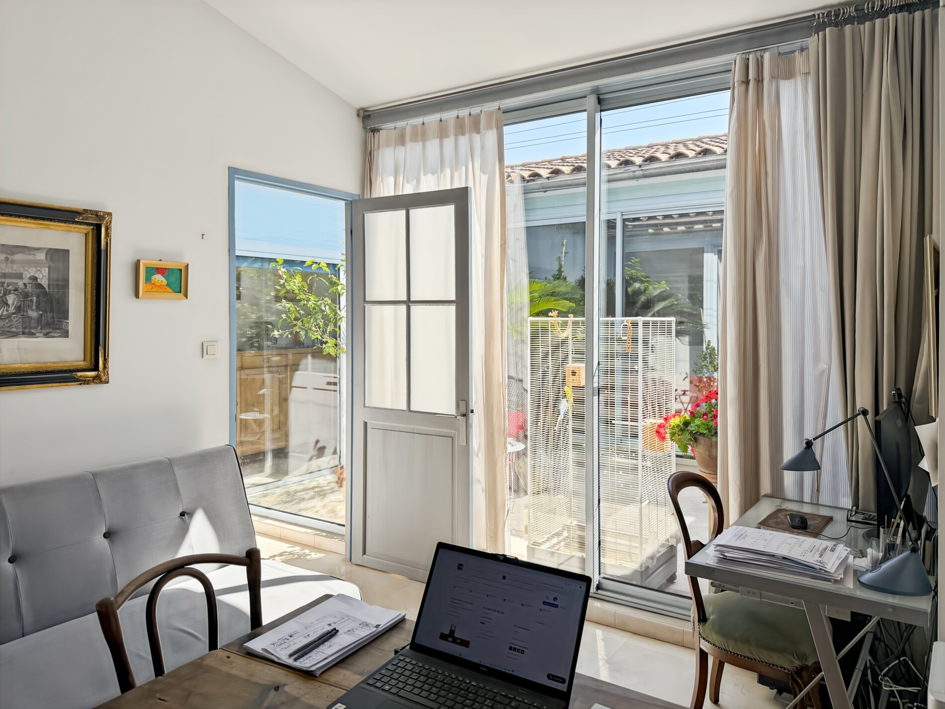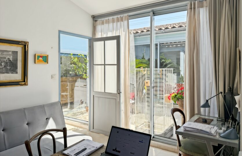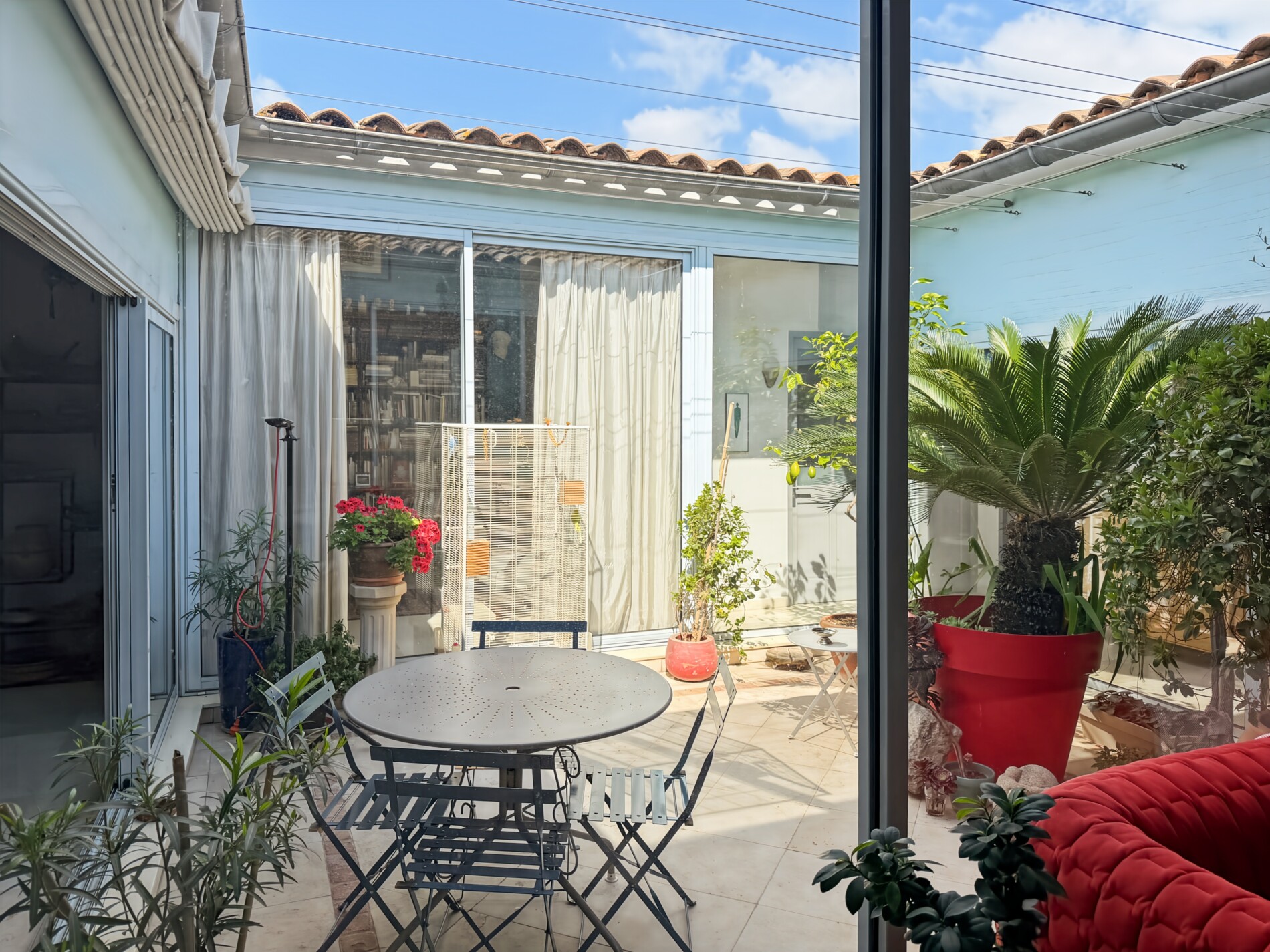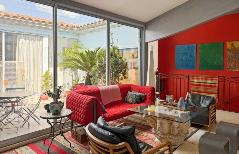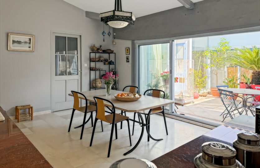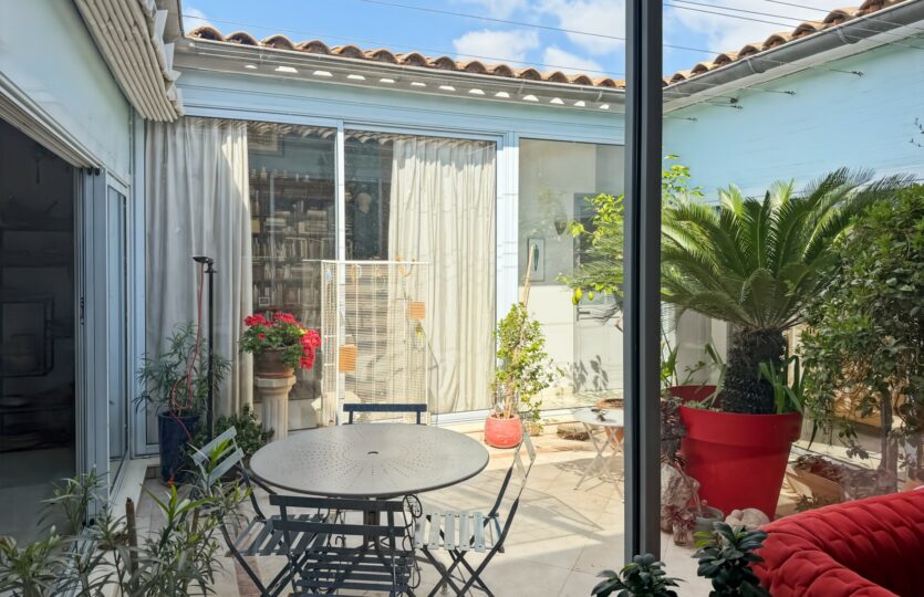 Maison avec patio Arles Située entre la croisière et la fondation LUMA, cette maison récente, a la particularité d’avoir un patio central, qui donne de la lumière naturelle à toutes les pièces.