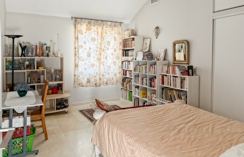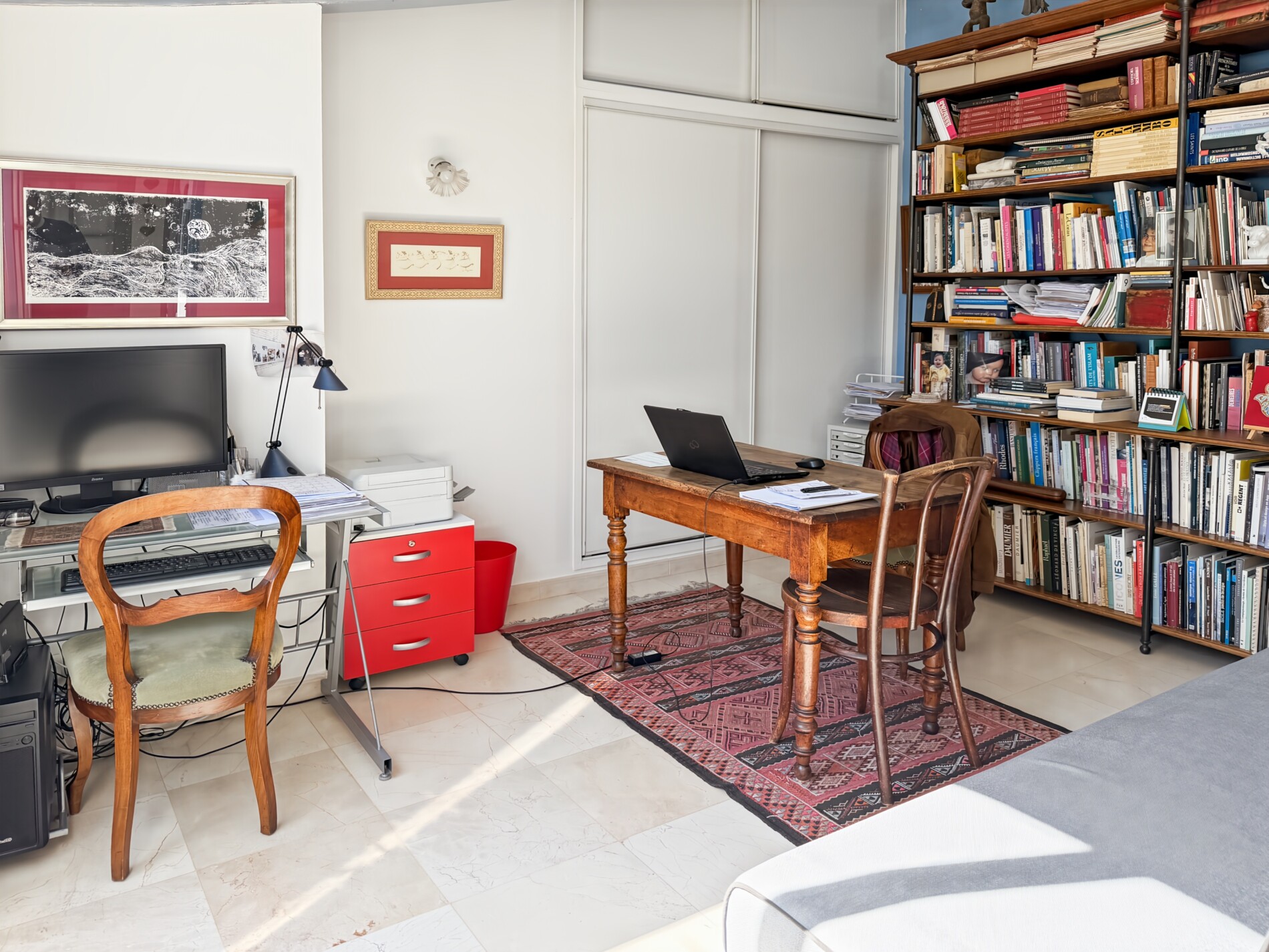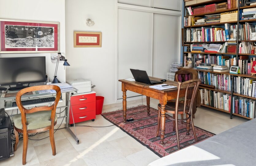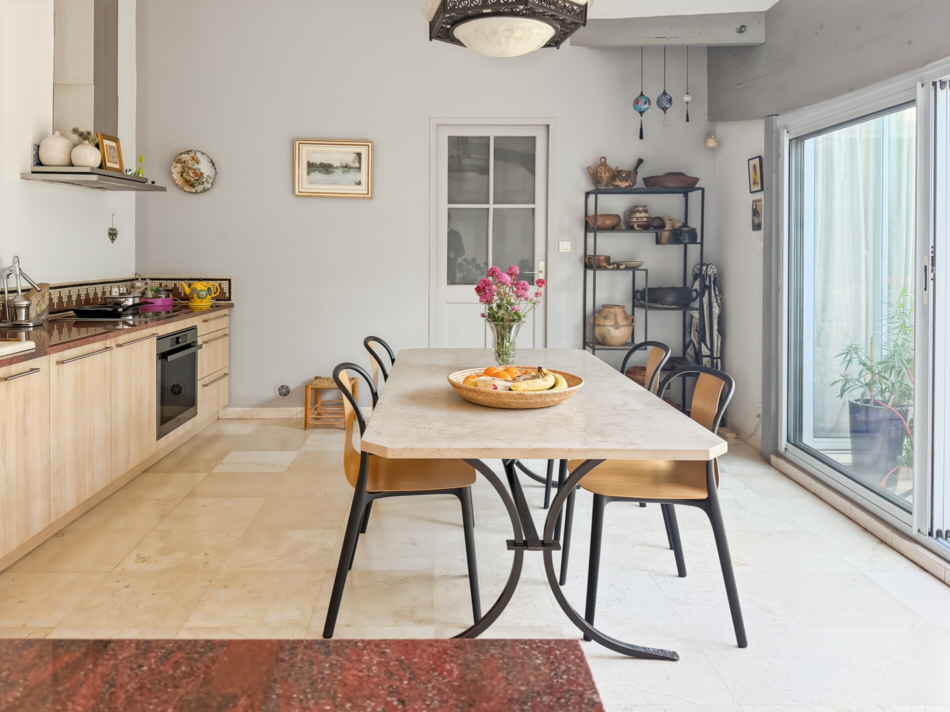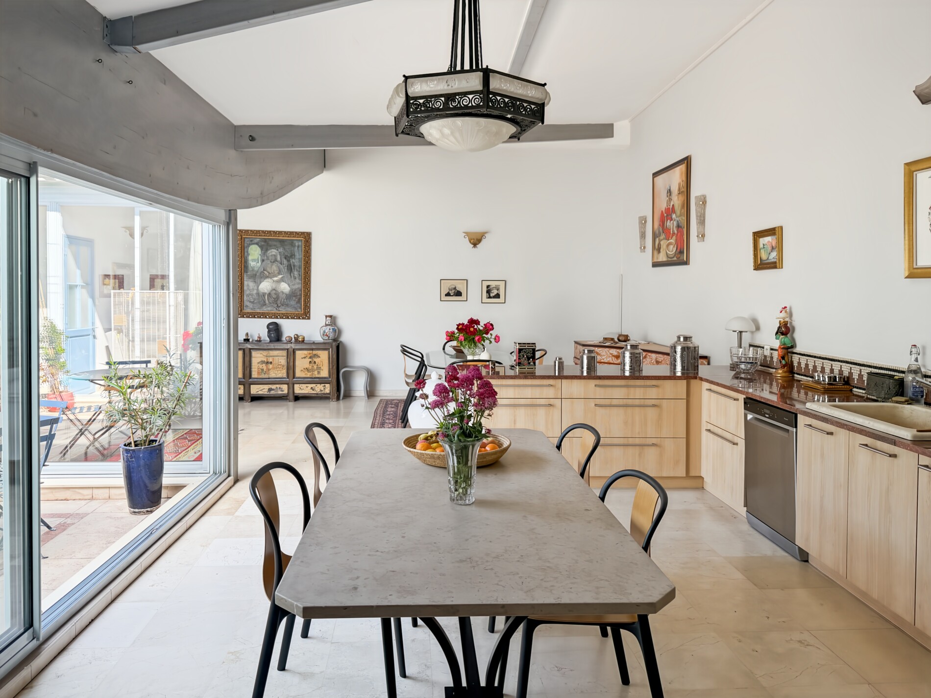 Au premier et dernier étage, on trouve donc ce patio, une grande cuisine ouverte sur cet extérieur, une arrière cuisine, un salon-salle à manger de 70 m2, trois chambres de plus de 15 m2 chacune et un bureau.